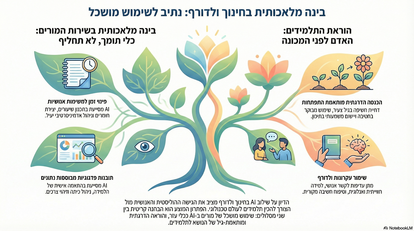 - העדפת הקשר האנושי: יש להדגיש את ה-AI ככלי תומך ולא כתחליף לאינטראקציה אנושית שהיא הליבה של מלאכת החינוך. על המורים להתמקד בקשר האישי החם, חמלה והבנה כלפי התלמידים, ולפעול באומץ כנגד הלחץ להפוך ל"טכנאים".