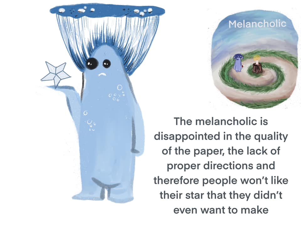 הילד הסינגוויני איבד את החומרים הנדרשים להכנה ולא יודע כלל איפה ימצא אותםהילד המלנכולי יהיה מאוכזב מאיכות הנייר, מהיעדר הנחיות מדוייקות ולכן אנשים לא יאהבו את הכוכב שלהם, שאותו אפילו לא רצו להכין...